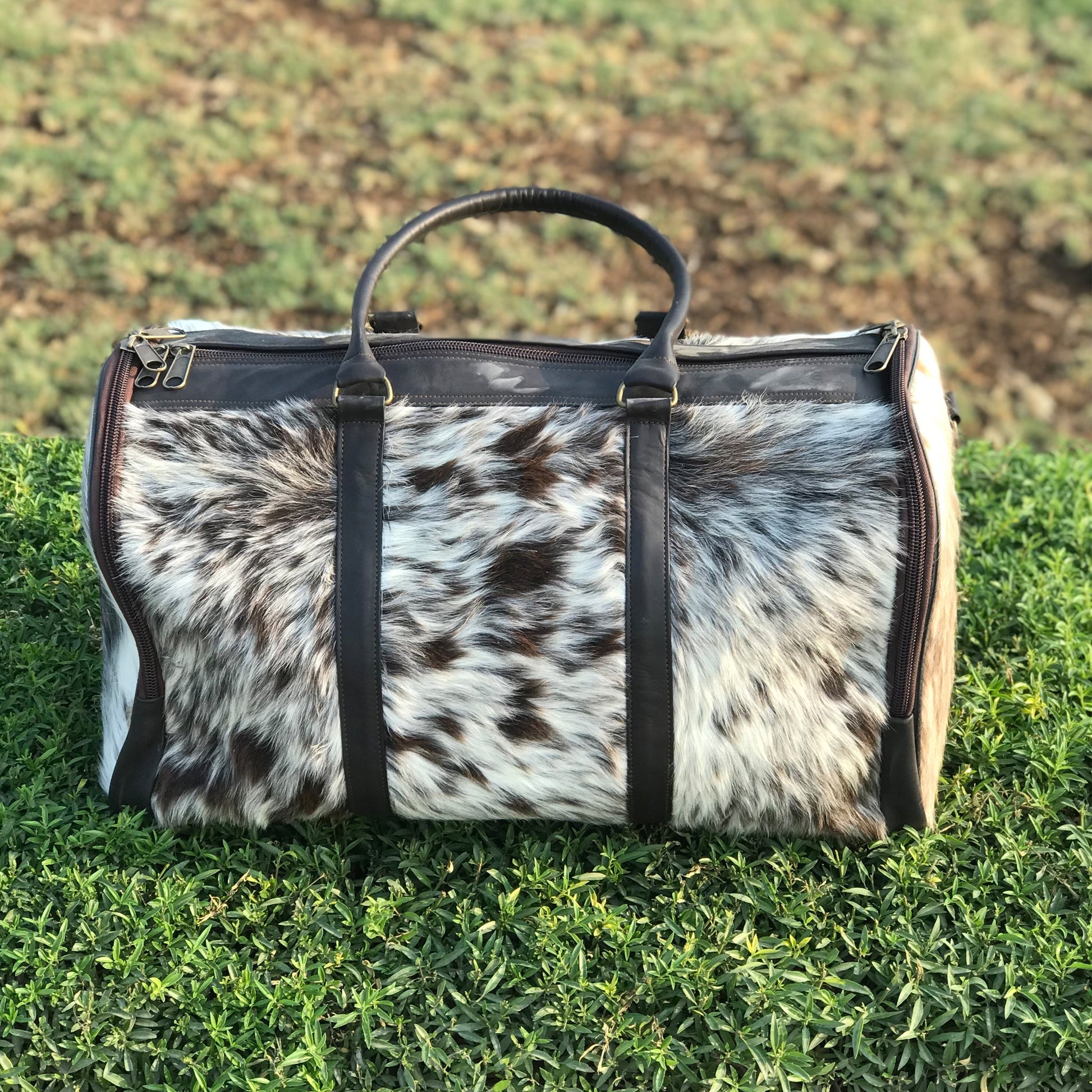 A statement in motion — The Heritage Cowhide Duffel embodies timeless craftsmanship and refined travel style. Handcrafted from authentic cowhide leather, each piece is one-of-a-kind, showcasing the natural beauty of its unique hair-on pattern. Medium in size yet generous in design, it offers both sophistication and functionality for every journey.